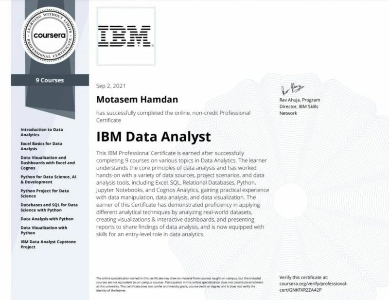 في عصر تحكمه البيانات وتستند فيه القرارات إلى الأرقام والمؤشرات، لم تعد مهارات تحليل البيانات ترفًا، بل أصبحت من الضروريات الأساسية لأي فرد يسعى إلى التميز في مسيرته المهنية. سواء كنت طالبًا تتطلع إلى اكتساب مهارات عملية، أو محترفًا في مجال الأعمال يسعى لتعزيز قدراته، أو حتى مطورًا ناشئًا يبحث عن أدوات لفهم البيانات الضخمة، فإن كورس **IBM Data Analyst Professional Certificate** يمثل نقطة انطلاق مثالية لتعلم تحليل البيانات من الصفر حتى المستوى الاحترافي. **لماذا كورس IBM لتحليل البيانات؟** تقدمه شركة IBM، أحد عمالقة التكنولوجيا والذكاء الاصطناعي، بالتعاون مع منصة Coursera، ويعد من أكثر الكورسات طلبًا حول العالم. تم تصميم هذا البرنامج التدريبي ليأخذ المتعلم في رحلة متكاملة تغطي كل المهارات الأساسية المطلوبة لتحليل البيانات بشكل عملي ومبسط.البرنامج لا يشترط خلفية تقنية مسبقة، ما يجعله مناسبًا للجميع، ويمنح في نهايته شهادة احترافية معترف بها عالميًا. --- **ماذا ستتعلم في هذا الكورس؟** يتكون الكورس من **9 وحدات تدريبية** تغطي جميع مراحل تحليل البيانات، من جمع البيانات وتنظيفها، إلى عرضها بصريًا واتخاذ قرارات مبنية على البيانات. إليك نظرة تفصيلية على ما ستكتسبه: 1. **أساسيات تحليل البيانات** تبدأ الرحلة بتعريف شامل بعلم البيانات، أدوار محللي البيانات، وأخلاقيات استخدام البيانات، لتكوين فهم واضح للأساسيات قبل الدخول في الأدوات العملية. 2. **إتقان برنامج Excel** يتعلم المتدرب كيفية استخدام Excel في تحليل البيانات، من الصيغ والجداول المحورية، إلى الرسوم البيانية وتحليل الاتجاهات، مما يجعله أداة قوية لإدارة البيانات. 3. **العمل مع قواعد البيانات باستخدام SQL** يتضمن الكورس وحدة خاصة بلغة SQL، حيث يتمكن المتدرب من التعامل مع قواعد البيانات، إجراء الاستعلامات المعقدة، واستخراج البيانات المطلوبة. 4. **تحليل البيانات باستخدام Python** من خلال مكتبات مثل Pandas وNumPy، يتمكن المتعلم من تحليل مجموعات بيانات حقيقية، وتنظيفها، وتحويلها لرؤى واضحة باستخدام بايثون. 5. **تصوير البيانات باستخدام أدوات احترافية** يتعلم المتدرب استخدام أدوات مثل **Matplotlib** و**Seaborn** في بايثون، وكذلك **IBM Cognos Analytics** لإنشاء لوحات معلومات تفاعلية (Dashboards) تفيد في تقديم البيانات بصورة احترافية وجذابة. 6. **مشاريع تطبيقية عملية** يقدم الكورس مشاريع تحليل بيانات واقعية، تمكّن المتعلم من تطبيق ما تعلمه على سيناريوهات حقيقية، وهو ما يعزز الفهم ويمنح خبرة عملية. --- **مميزات كورس IBM لتحليل البيانات** * ✅ **لا يشترط خبرة سابقة**: مناسب للمبتدئين تمامًا، سواء في البرمجة أو تحليل البيانات.* 🎓 **شهادة احترافية من IBM**: يمكن إضافتها إلى سيرتك الذاتية أو ملفك على LinkedIn، وهي معترف بها من الشركات الكبرى.* 🌐 **تعلم عملي عبر الإنترنت**: يمكنك التعلم بالوتيرة التي تناسبك، وفي أي وقت يناسب جدولك.* 💼 **تحضير لسوق العمل**: الكورس يركز على المهارات العملية المطلوبة فعليًا في سوق العمل، مما يعزز فرص التوظيف.* 📊 **مشاريع واقعية**: تتعامل مع بيانات حقيقية وتقوم ببناء لوحات معلومات وتحليلات مثل محللي البيانات المحترفين. --- **من يمكنه الاستفادة من الكورس؟** * **الطلاب والخريجون الجدد** الباحثون عن فرص عمل أو تطوير مهاراتهم.* **الموظفون في مجالات الإدارة، التسويق، أو المالية** ممن يرغبون في دعم قراراتهم بالبيانات.* **المبرمجون أو مطورو الويب** الذين يرغبون في التوسع نحو تحليل البيانات.* **أصحاب الأعمال الصغيرة** الذين يحتاجون إلى فهم بيانات عملائهم أو أداء مشاريعهم. --- الحصول علي الكورس في عالم يتغير بسرعة ويعتمد على البيانات في جميع المجالات، لم يعد تعلم تحليل البيانات رفاهية. كورس IBM لتحليل البيانات يقدم لك الأدوات، والخبرة، والشهادة التي تؤهلك للنجاح في أي مهنة مستقبلية تعتمد على البيانات. ومع الدعم من شركة مرموقة مثل IBM، تكون قد وضعت قدمك بثبات على طريق الاحتراف. للحصول علي الكورس اضغط هنا